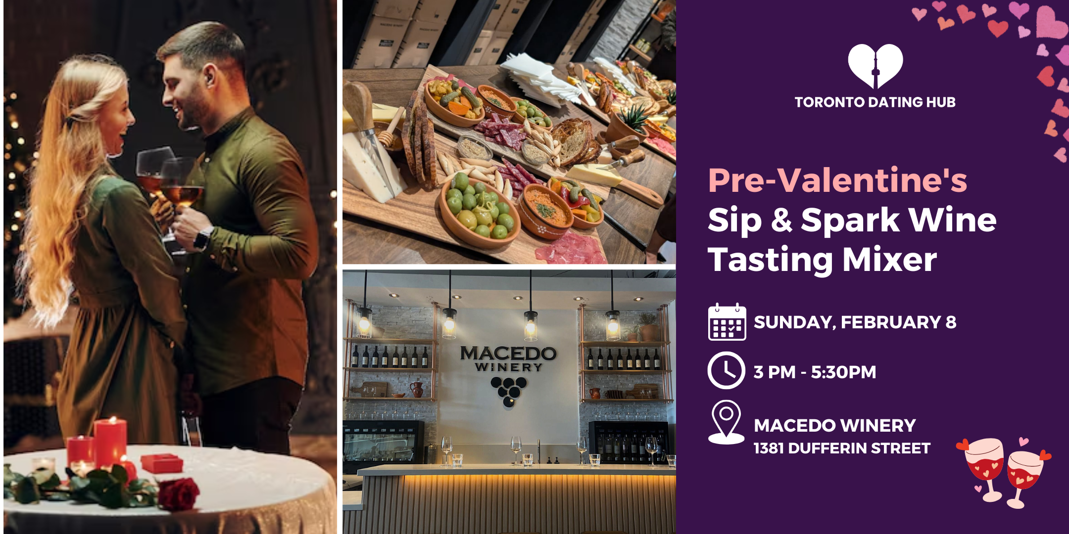 Join Toronto Dating Hub for a refined, pre-Valentine’s wine tasting mixer at Macedo Winery, a family-owned hidden gem known for its warm atmosphere and exceptional wines.